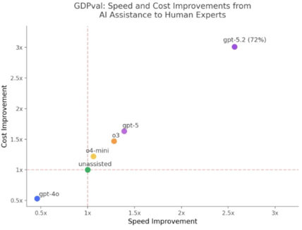 Ethan Mollick ha evidenziato i risultati di benchmark (GDPval framing) suggerendo un salto da ~39% a ~72% nei risultati pari o superiori a quelli degli esperti umani sulla stesura di bozze per modelli di classe GPT-5.2.